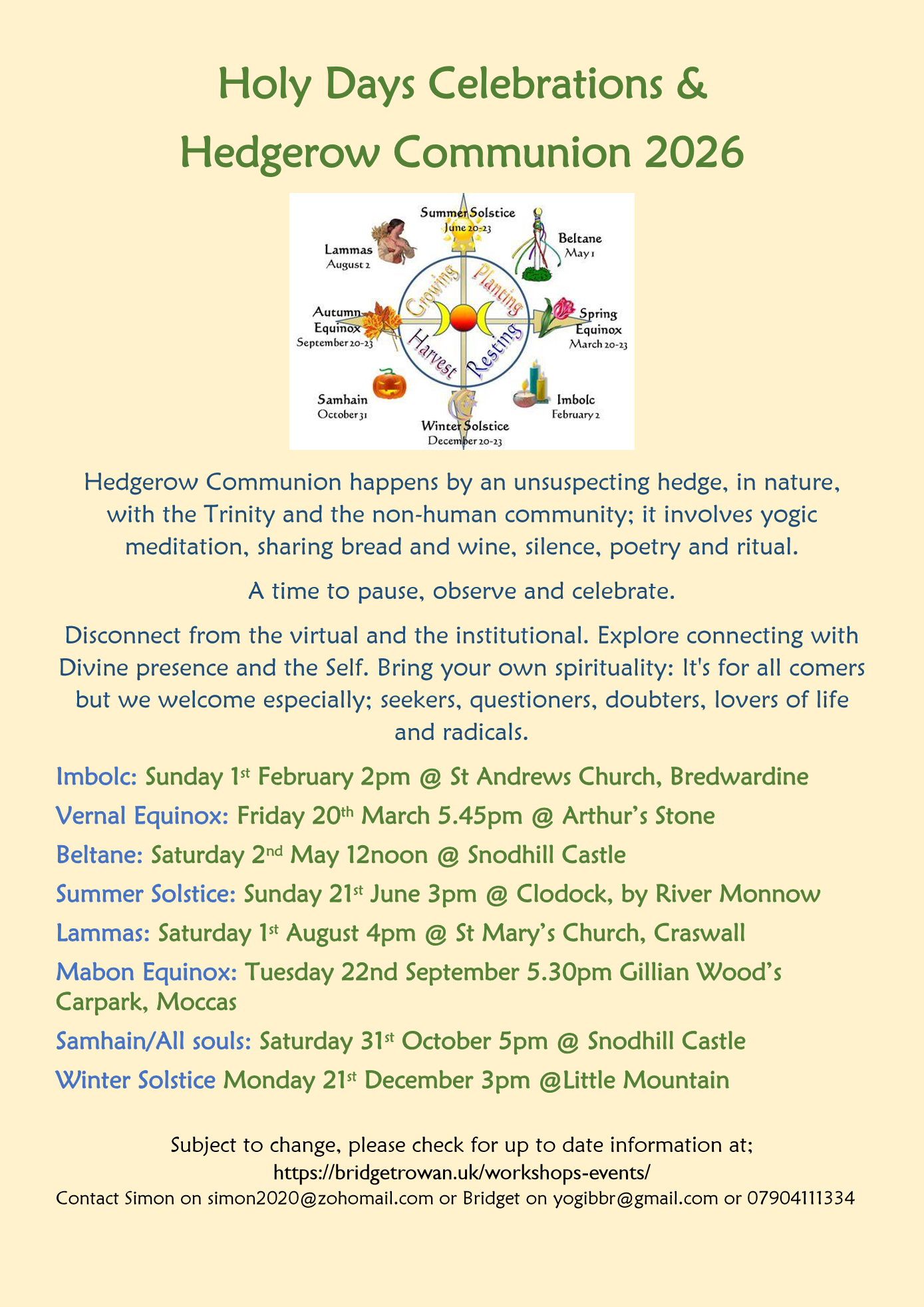 Simon: simon2020@zohomail.com or Bridget: yogibbr@gmail.com