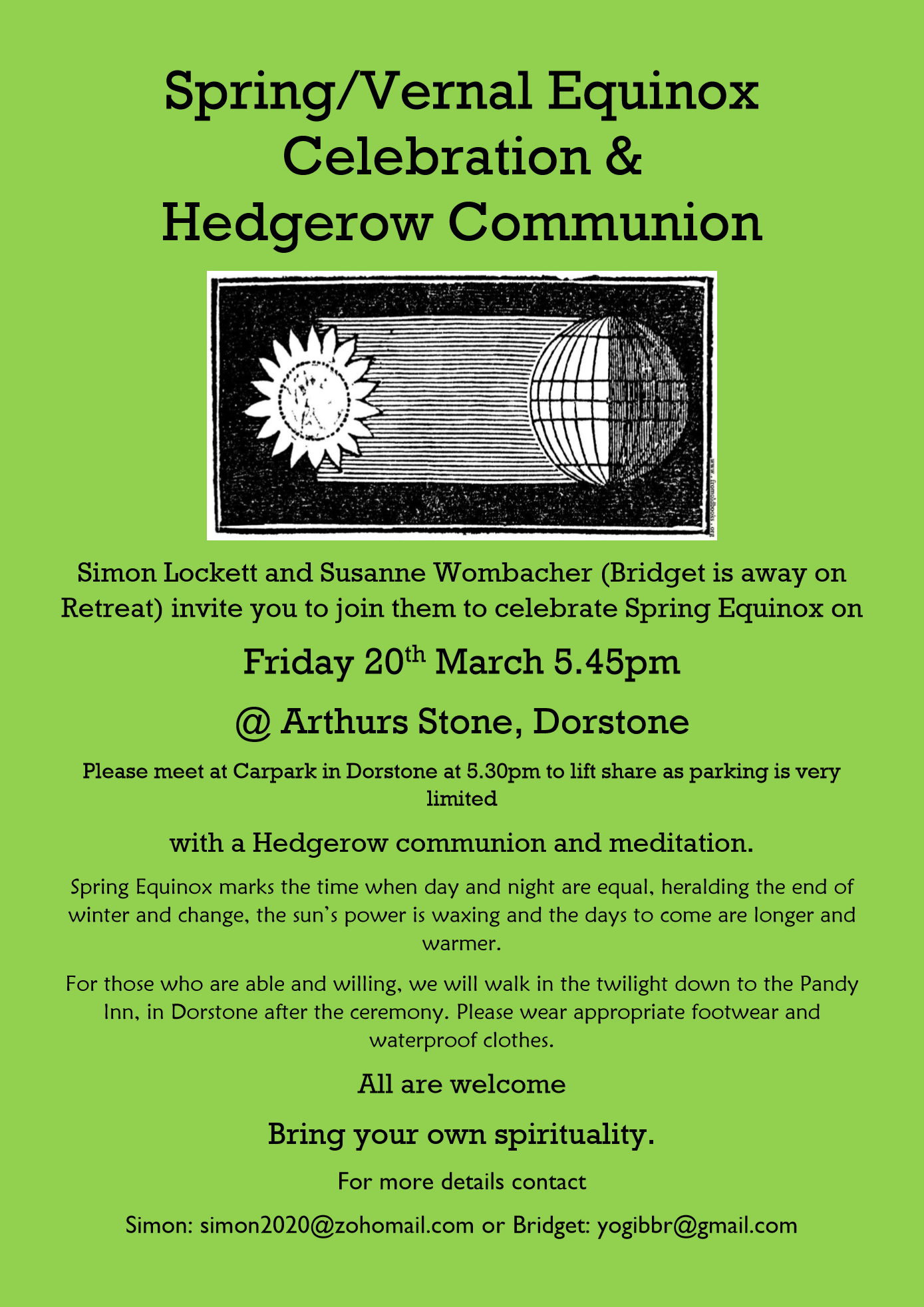 Come & celebrate Spring Equinox with your community, led by Simon Lockett and Susanne Wombacher (Bridget is away on retreat)